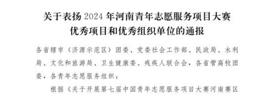 近日,由共青团河南省委、中共河南省委社会工作部、河南省民政厅、河南省水利厅、河南省文化和旅游厅、河南省卫生健康委员会、河南省残疾人联合会共同举办的“第七届中国青年志愿服务项目大赛河南赛区选拔赛暨2024年河南青年志愿服务项目大赛”获奖情况公布,mg4355官网青年志愿者联合会“星愿”支教志愿服务项目和计算机与信息工程学院“学以致用,捷诚服务”志愿服务项目荣获2024年河南青年志愿服务项目大赛“铜奖”。