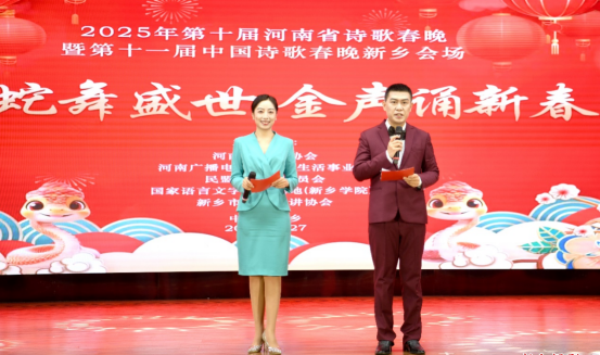 瑞蛇舞盛世,金声诵新春!为深入学习贯彻习近平文化思想,更好凝聚力量、提振信心唱响奋进新时代的主旋律,营造欢乐喜庆祥和的节日氛围,更好满足人民群众高品质的精神文化需求。12月27日,第十届河南省诗歌春晚暨第十一届中国诗歌春晚新乡会场活动在mg4355cc线路检测文化艺术中心成功举办。本次活动由国家语言文字推广基地(mg4355cc线路检测)与河南省朗诵协会、河南广播电视台都市生活事业部、民盟新乡市委员会、新乡市朗诵演讲协会共同主办。新乡市政协原副主席、市朗诵演讲协会顾问史玉璞,市文联党组书记、主席罗强,mg4355cc线路检测党委副书记、国家语言文字推广基地(mg4355cc线路检测)副主任宋伟,mg4355cc线路检测语言文字工作委员会办公室主任、教务处处长兼课程中心主任高雪霞等现场观看了晚会。河南省朗诵协会副会长宋扬,河南省朗诵协会副会长、新乡市朗诵演讲协会主席侯玮青,中国诗歌春晚签约朗诵家、河南省朗诵协会学术技术带头人曹军帅等参加演出。