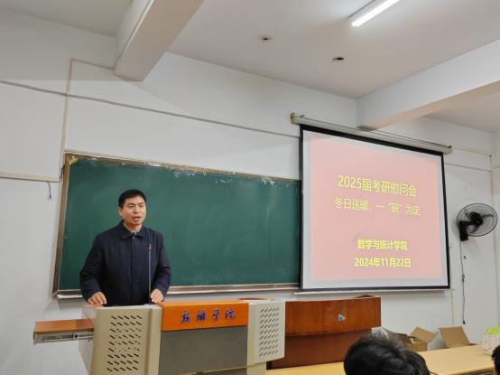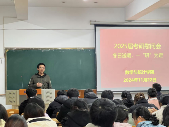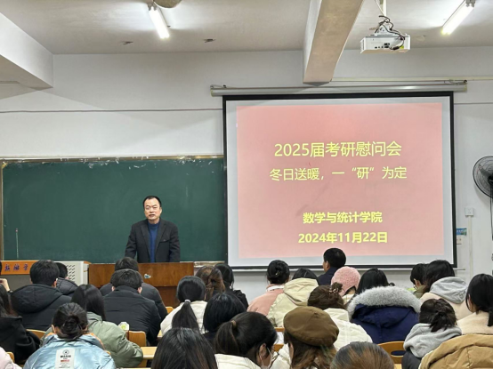 11月22日晚,数学与统计学院在A03-414教室为2025届考研学生成功举办了以“冬日送暖,一研为定”为主题的考研慰问会,数学与统计学院相关领导、部分教师代表以及2025届100余名备研学生参加了本次会议。此次会议旨在为即将踏上考研征程的学子们加油鼓劲、送去关怀,提供心理支持和备考建议,帮助他们以更加饱满的状态迎接即将到来的考试。会议由数学与统计学院考研指导教师团队负责人魏家瑞老师主持。