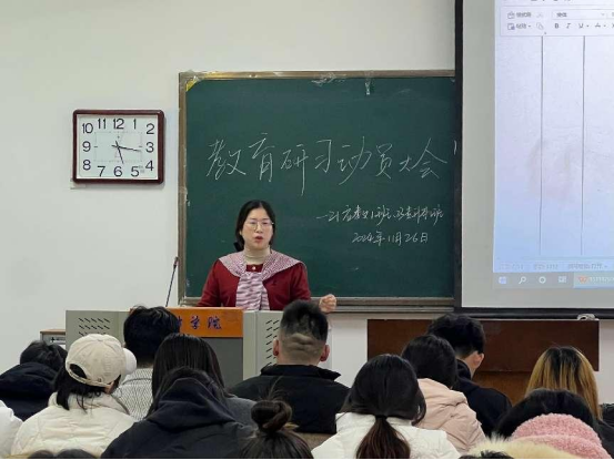 11月27日下午,数学与统计学院在A03-209教室举行了2025届数学与应用数学专业教育研习动员会。此次动员会旨在为80名即将进行教育研习的师范生提供指导和激励,确保他们在这个重要的学习阶段中取得丰富的经验、收获丰硕成果。数学与统计学院副院长皮磊、数学与应用数学教研室主任张玲瑞参加了动员大会。