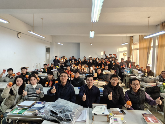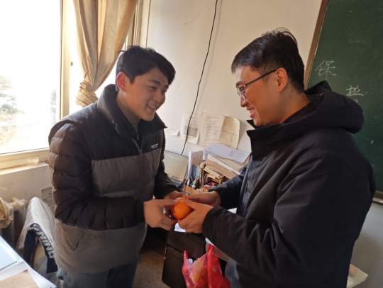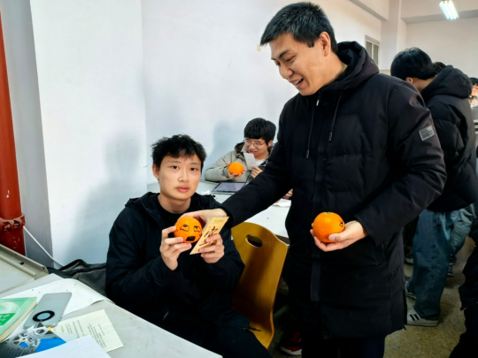 随后,领导与老师们逐一走到每位考研学子的座位旁,亲手将贺卡和橙子递到他们手中。每一张贺卡上都写着老师们对她们的个性化鼓励与祝福,每一个橙子都承载着老师们对他们的深切关怀与真切祝愿。